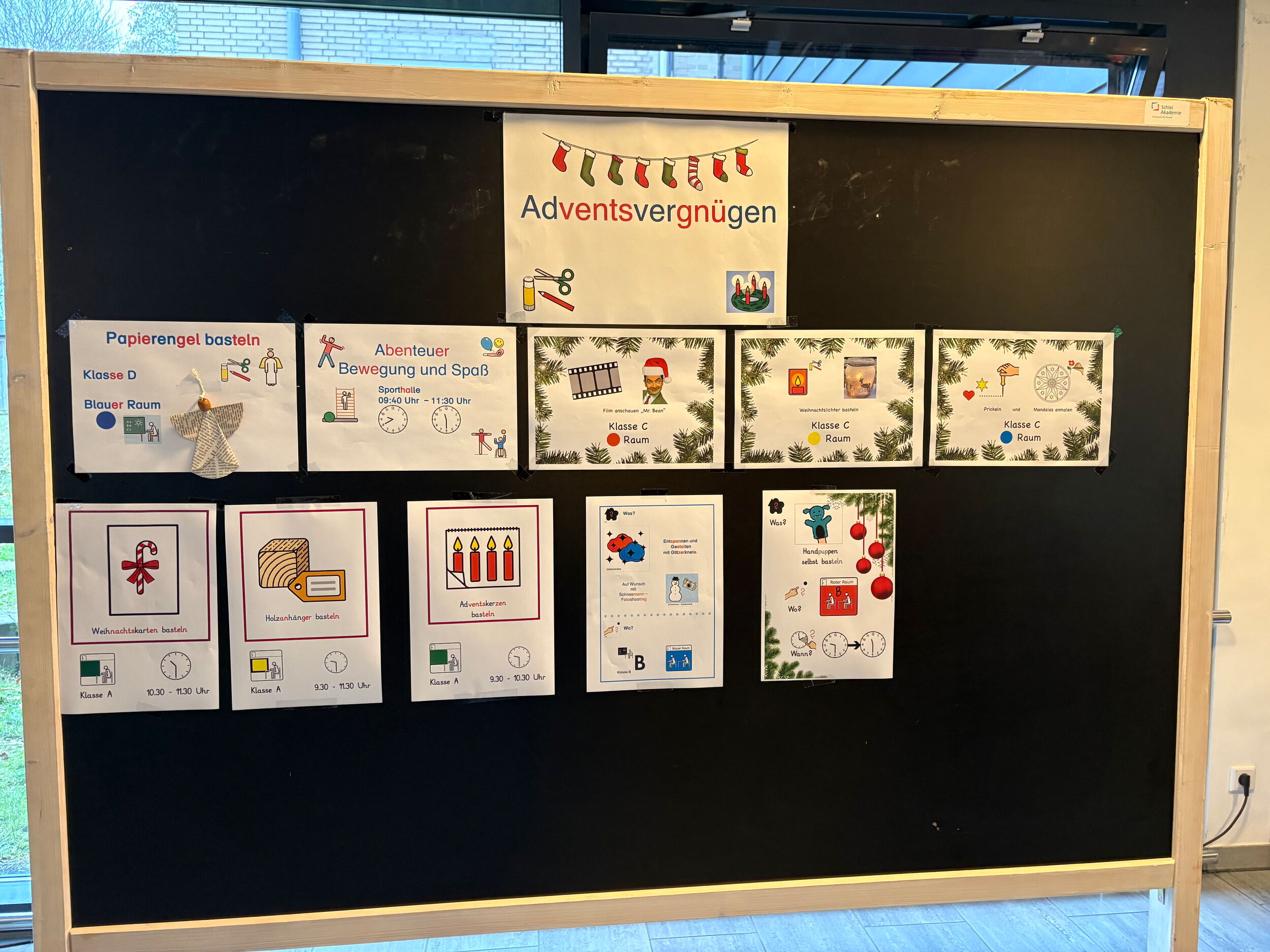 Beim diesjährigen Adventsvergnügen verwandelte sich unsere Schule in eine stimmungsvolle Weihnachtswerkstatt. In jedem Klassenraum wartete ein anderes kreatives Bastelangebot, aus dem die Kinder ganz frei auswählen konnten. Ob Sterne, Karten oder kleine Geschenke. Überall wurde fröhlich geschnitten, geklebt und gestaltet. In der Turnhalle wartete außerdem eine weihnachtliche Bewegungslandschaft auf die Schülerinnen und Schüler. Für das leibliche Wohl sorgten duftende Waffeln, leckerer Kuchen und wärmender Kinderpunsch. Auch einige Gäste nutzten die Gelegenheit, vorbeizuschauen und die vorweihnachtliche Stimmung zu genießen. Musikalische Beiträge zum Auftakt und zum Abschluss rundeten den Nachmittag ab und machten das Adventsvergnügen zu einem besonderen Erlebnis für die ganze Schulgemeinschaft.