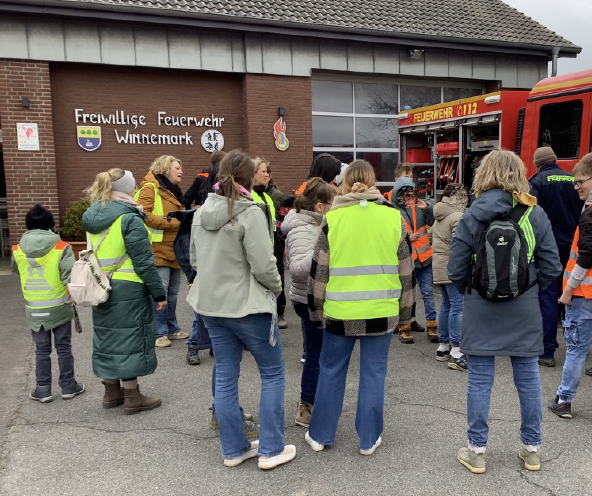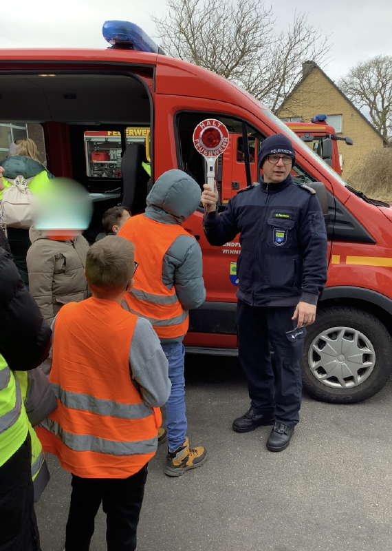 Am Freitag, den 13. März 2026 waren wir bei der Feuerwehr in Winnemark. Wir haben Feuerwehrautos gesehen. Der Feuerwehrmann Baddi hat uns das große Auto gezeigt. Darin waren eine Kelle, Löschschaum, ein Besen, die Feuerwehrwesten, Atemschutzmasken, Mundschutz, Sauerstoffflaschen, ein großer Wassertank, eine Schwimmpumpe, viele Schläuche, Werkzeuge, z.B. eine Säge und eine Axt, Leitern und ein Scheinwerfer. Es waren auch Funkgeräte an. Wir durften mit dem Feuerwehrauto fahren. Es wurde sogar die Sirene und das Blaulicht angemacht. Das war toll. Wir waren auch im Gruppenraum. Das war interessant. Da waren alte Fotos, ein alter Helm, Pokale und ein alte Sirene. Die Feuerwehr hat vor kurzem neue Helme und neue Uniformen bekommen. Ein Schüler aus unserer Klasse macht schon bei der Feuerwehr mit.