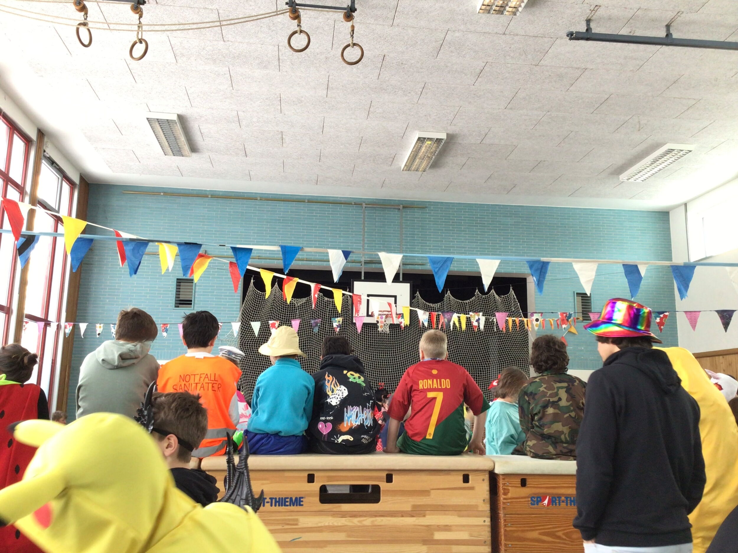 Bei unserer diesjährigen Faschingsfeier herrschte eine fröhliche und ausgelassene Stimmung. Zu dem Fest waren auch Schulen aus der Umgebung eingeladen, sodass viele Schülerinnen und Schüler gemeinsam feiern konnten. Die Turnhalle war bunt dekoriert und sorgte für eine richtige Faschingsatmosphäre. Viele Schülerinnen und Schüler kamen fantasievoll verkleidet, wodurch ein besonders farbenfrohes Bild entstand. Für gute Stimmung sorgte außerdem Musik, zu der getanzt und gefeiert wurde. Ein großes Dankeschön gilt dem Service-Team der Klasse D, das das Essen verteilte, das zuvor von allen mitgebracht worden war. So konnten sich alle zwischendurch stärken. Zusätzlich gab es verschiedene Spiele, bei denen viel gelacht wurde.