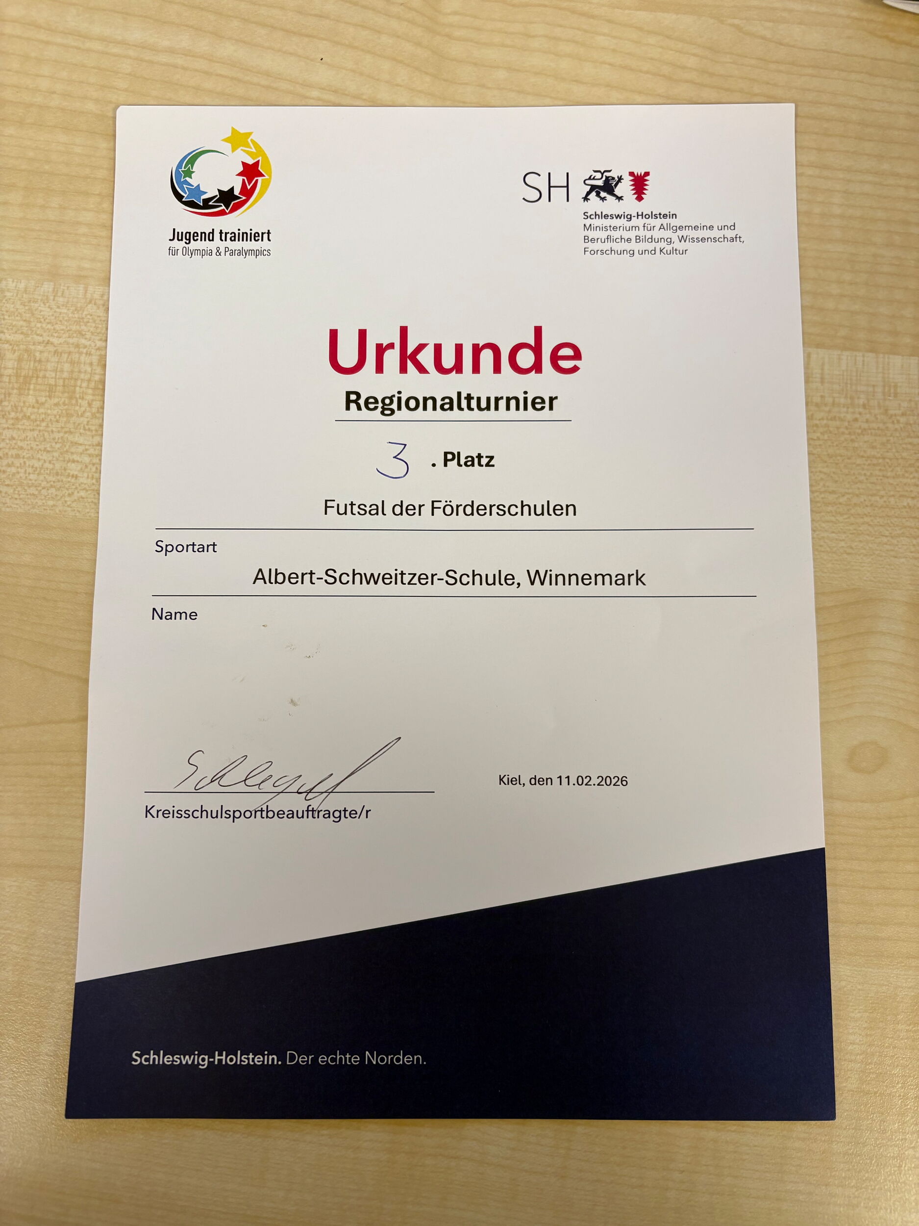 Unsere Schulmannschaft hat erfolgreich am Regionalturnier im Fußball in Kiel teilgenommen. Mit viel Einsatz, Teamgeist und großem Kampfwillen trat das Team gegen starke Konkurrenz an. In mehreren spannenden Spielen konnten unsere Spielerinnen und Spieler ihr Können zeigen und sich hervorragend behaupten. Am Ende wurde der Einsatz belohnt: Unsere Schulmannschaft erreichte einen tollen 3. Platz. Das ist eine starke Leistung, auf die alle Beteiligten sehr stolz sein können. Herzlichen Glückwunsch an das Team zu diesem großartigen Erfolg!