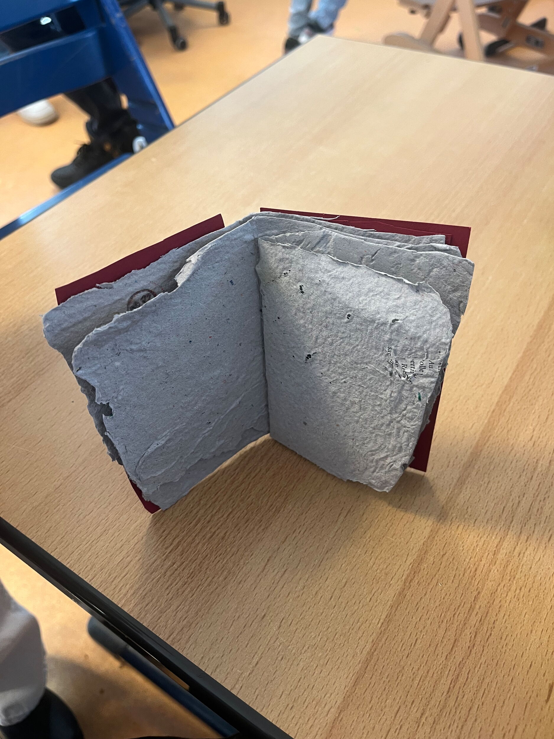 Im Sachunterricht hat Klasse A den Weg vom einzelnen Blatt bis zum eigenen kleinen Buch erlebt. Die Schülerinnen und Schüler stellten zunächst ihr eigenes Papier her, banden daraus anschließend Seiten zu einem Heft und bedruckten dieses zum Schluss mit Teilwiese auch selbstgemachten Stempeln. Dabei lernten sie nicht nur viel über die Geschichte von Papier und Büchern, sondern auch über deren aufwendige Herstellung.