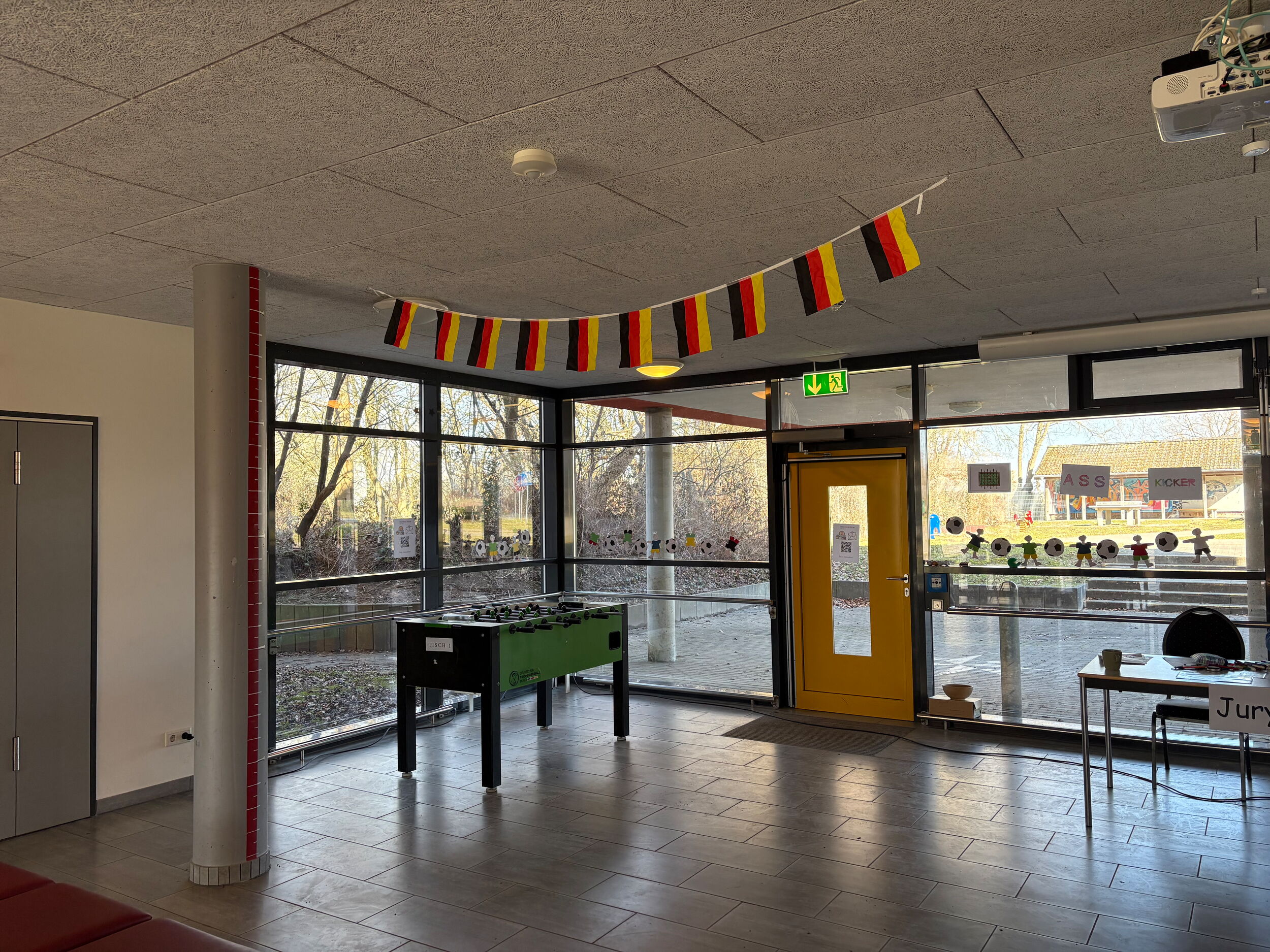 Beim diesjährigen Tischkicker-Turnier herrschte wieder großartige Stimmung. Insgesamt 8 Teams, bestehend aus jeweils vier Schülerinnen und Schülern, traten gegeneinander an. Gespielt wurde in einer Hin- und Rückrunde, sodass jedes Team mehrere spannende Begegnungen bestreiten konnte. Während der Spiele sorgten die anderen Schülerinnen und Schüler für eine tolle Atmosphäre, indem sie ihre Teams lautstark anfeuerten und unterstützten. Der Raum war außerdem schön dekoriert, was dem Turnier eine besonders festliche Stimmung verlieh. Am Ende wurden die Leistungen aller Teams gewürdigt und Urkunden überreicht. Das Turnier war ein voller Erfolg und hat allen Beteiligten viel Spaß gemacht.